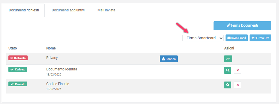 Aggiunta la possibilità di firmare tramite Smart Card. Quando si clicca su "Firma Documenti" si può scegliere tra: firma OTP, oppure, firma con Smart Card.